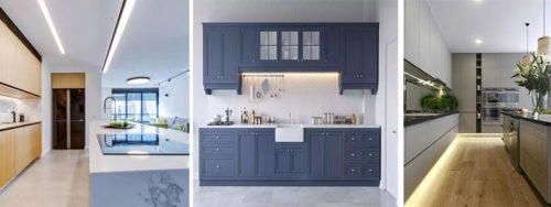 Lighting designers suggest not using spot lamps in kitchen cabinet and drawers , but using led strip lights to avoid the shadow and darkness area, ultra led strip and bar lights are the most ideal choice for kitchen lighting system. You may choose 3-5mm width led strip with tunable white colors
