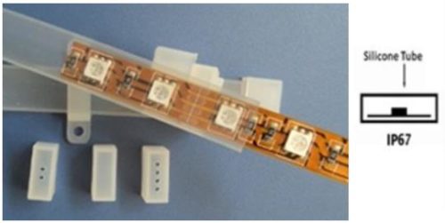 - IP67 led tape light has silicon tube as protection, which is extra flexible which can withstand temporary water less than 1m, but we don’t suggest put IP67 underwater usage, but it can be immerse in water for a little while, but it’s perfect for exterior environments and water-around area like pools, waterfalls, fountains. What’s more, it can be cut and re-seal easily.
